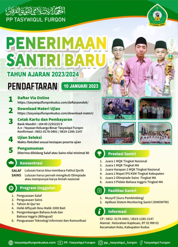 KUDUS – Pondok Pesantren Tasywiqul Furqon kembali menunjukkan eksistensinya dalam menjaga tradisi keilmuan kitab kuning di kancah nasional. Dua santri terbaiknya, Ahmad Reza Firdiansyah dan Musa Ibnu Mubarok, resmi didelegasikan untuk mengikuti ajang Musabaqoh Qiroatul Kutub (MQK) Nasional “BARIKNA” pada gelaran MBI Big Fair 17th. Kompetisi bergengsi ini diselenggarakan oleh Madrasah Bertaraf Internasional (MBI) Amanatul…