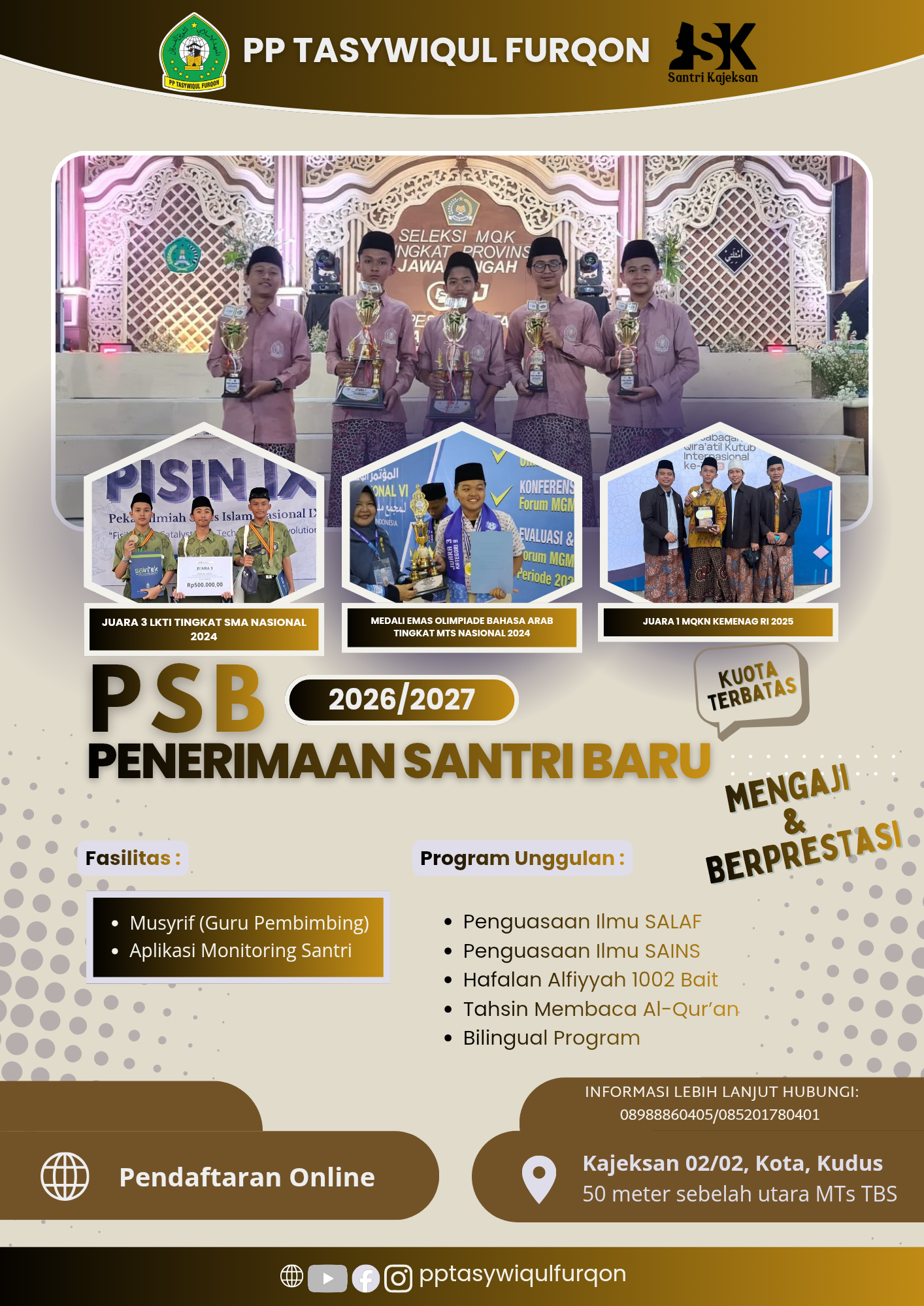 Jadwal pendaftaran santri baru dibuka pada 01 Januari 2026 hingga kuota terpenuhi.